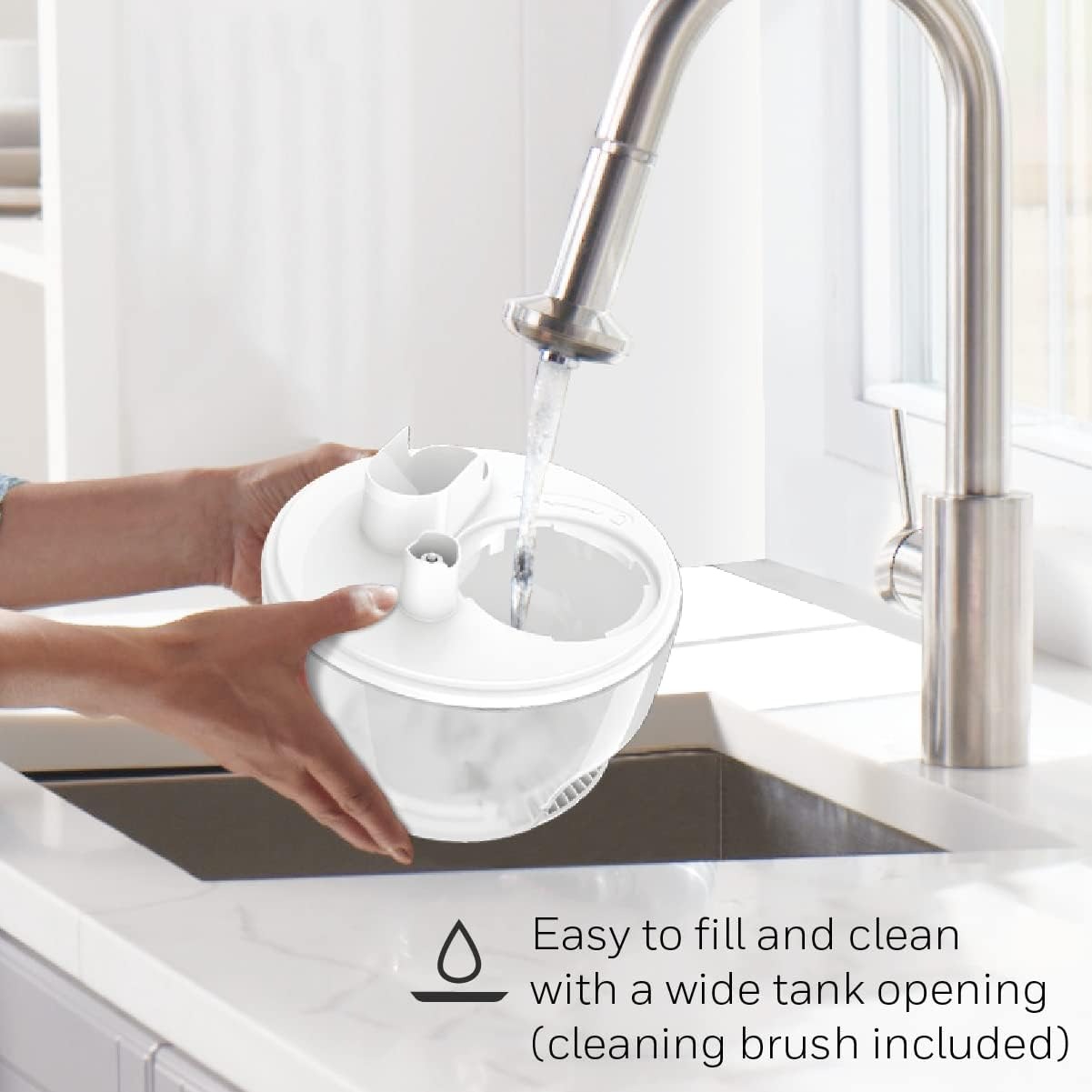 0.5加仑(1.89升)大容量水箱,宽大的注水口方便加水和清洁(附赠清洁刷)。非常适合小户型房间,每次加水后可连续运行长达24小时。如果水箱缺水,加湿器会自动关闭。
