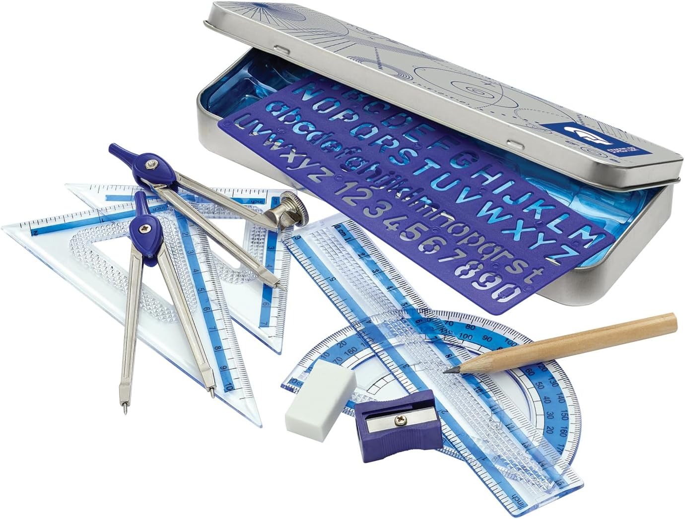 完整的绘图套装 – 该几何套装包括一个金属圆规、尺子、字母模板和两个三角板(30°/60° 和 45°),在一个有组织的套件中提供所有必要的绘图工具