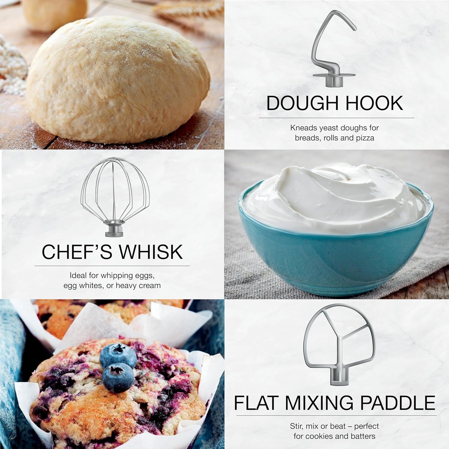 包括厨师机搅拌头、面团搅拌头、扁平搅拌桨、带倾倒口的防溅罩,说明书和食谱小册子