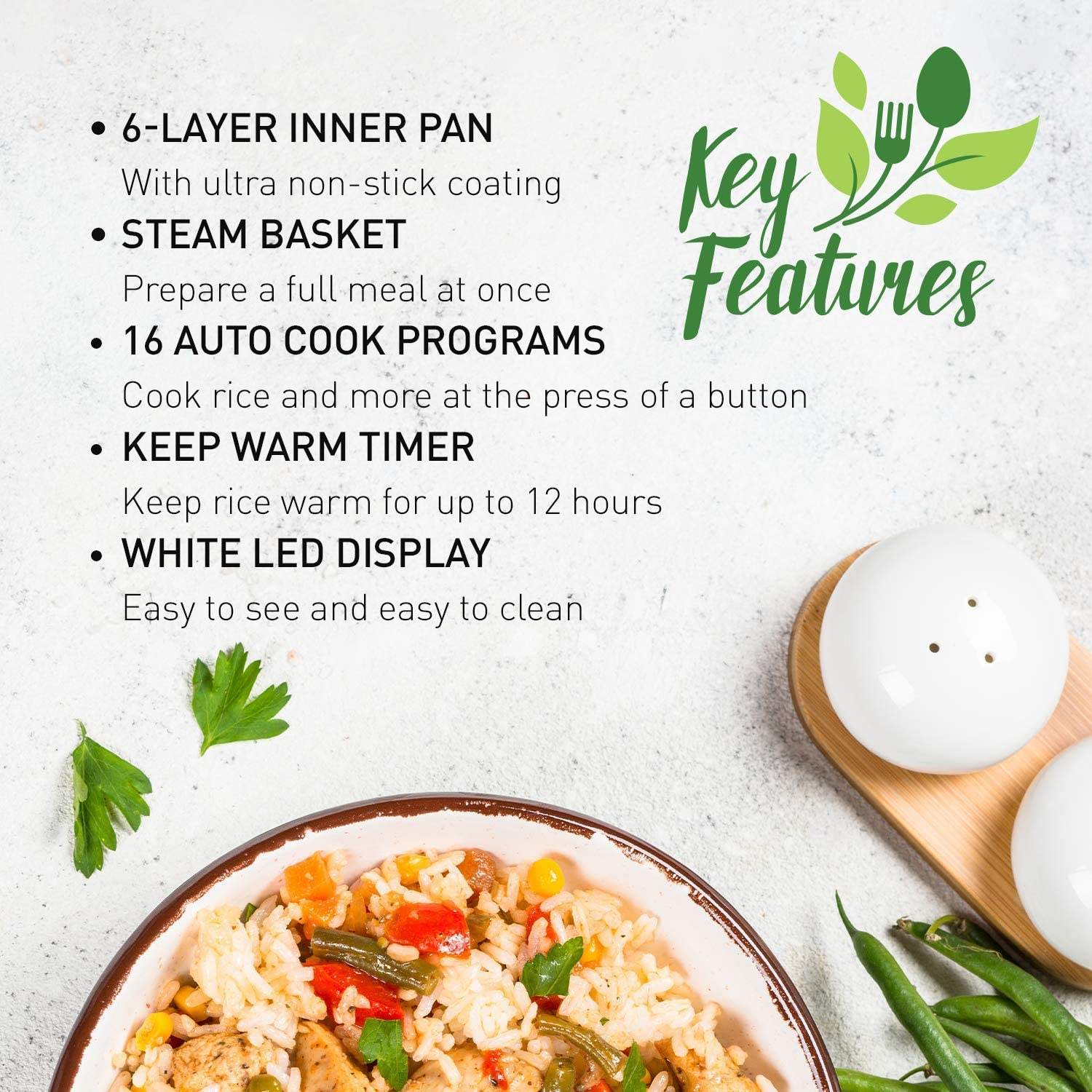 16个预设烹饪程序包括白米饭、粥,糙米,杂粮,藜麦,汤,慢煮功能,还可做蛋糕,面包,和蒸菜。