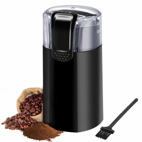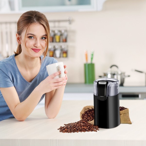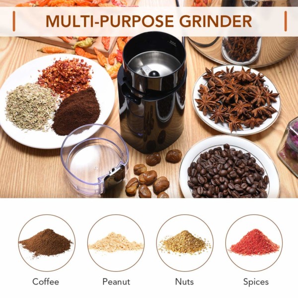 TOPELEK这款电动研磨机不只可以研磨咖啡豆,强力不锈钢刀片,可以轻松研磨咖啡豆,肉桂,胡椒,坚果和香料等。