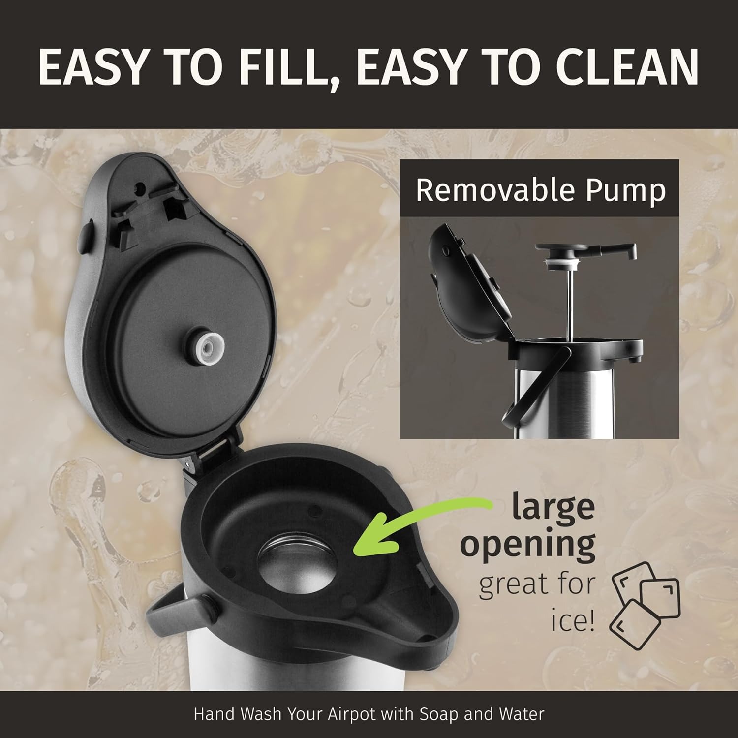 大口径设计,清洁和加水都非常方便。可以轻松地将咖啡、水或茶倒入咖啡壶中!使用完毕后,只需用湿海绵擦拭咖啡壶即可!