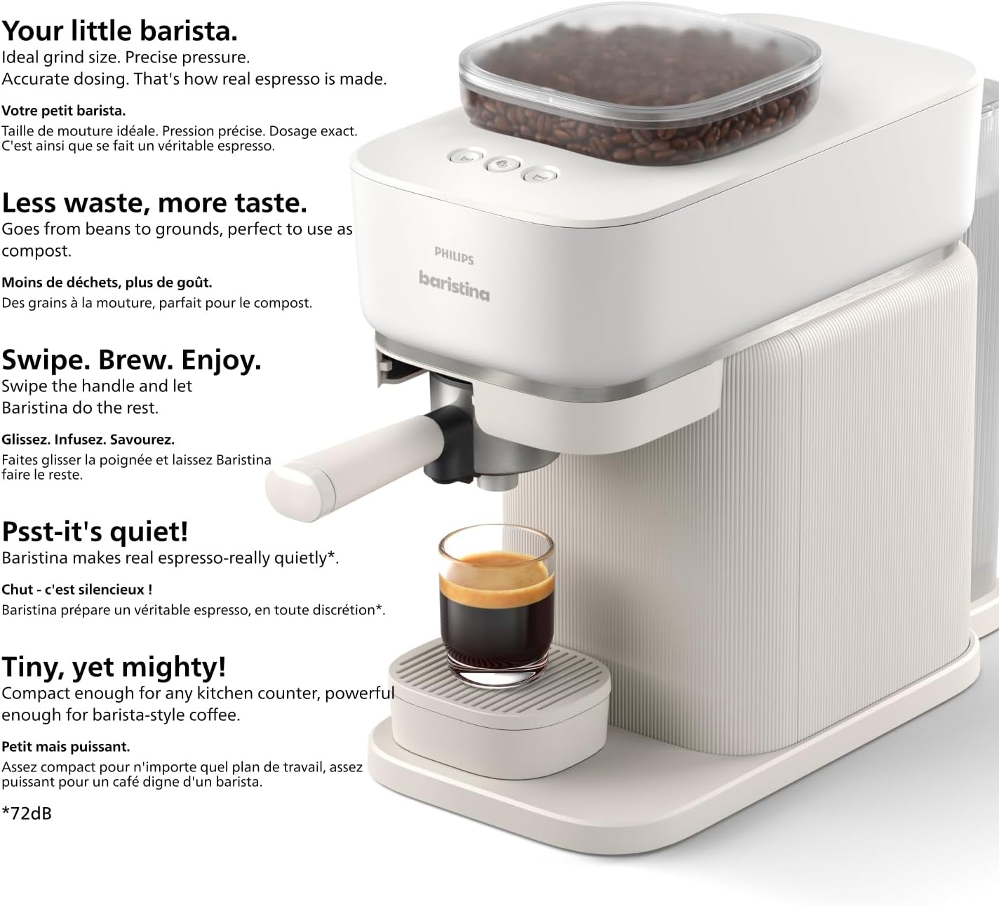 这款飞利浦 Baristina 浓缩咖啡机,可以轻松享用真正的意式浓缩咖啡,也可以调制拿铁、卡布奇诺和美式咖啡等咖啡馆风格的饮品。