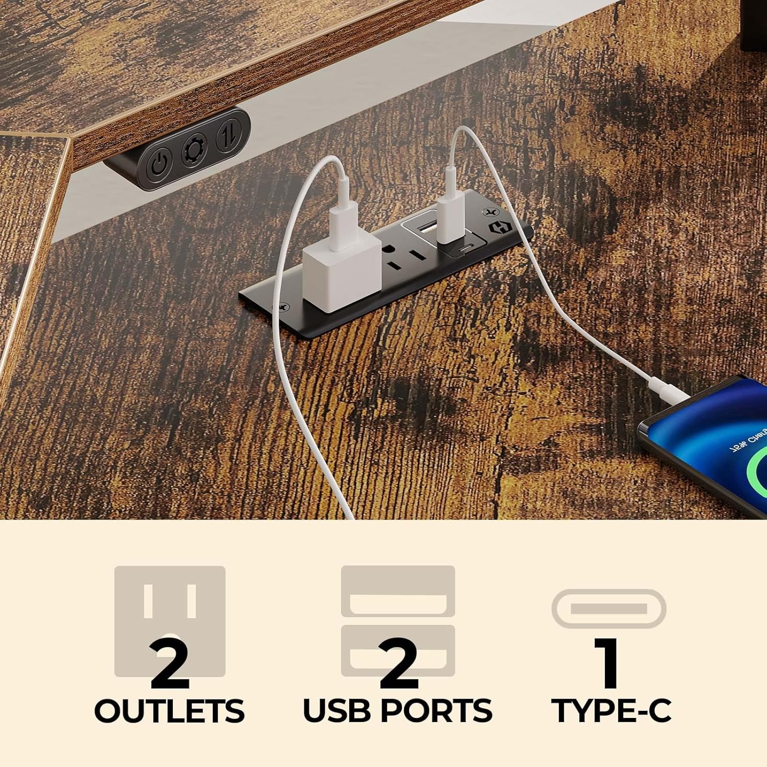 这款L型电脑桌配备内置电源插线板,带有2个插座和2个USB端口,方便为游戏设备、平板电脑或智能手机充电。