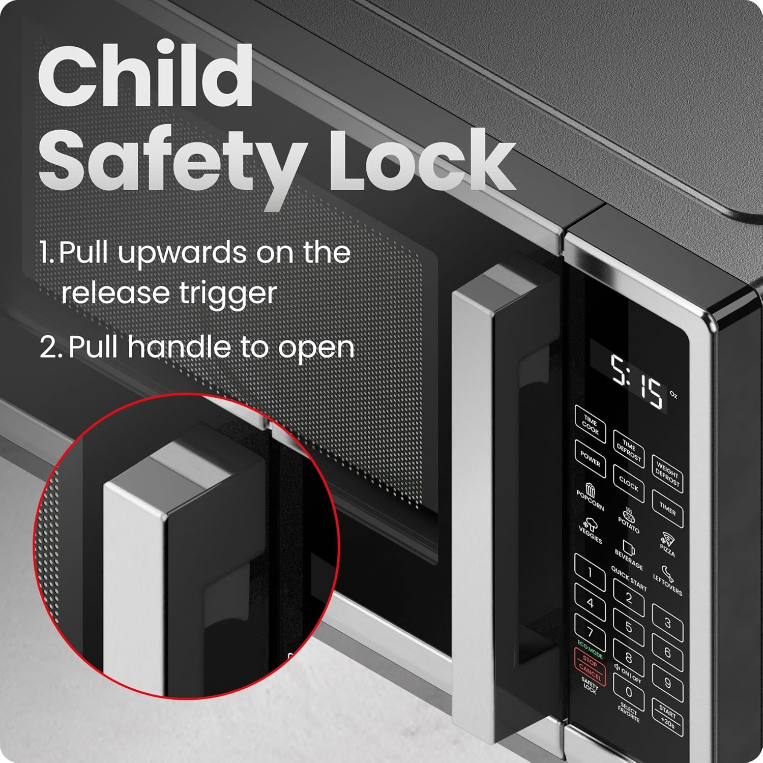 儿童安全锁模式可防止微波炉启动。按住“停止/取消”按钮3秒钟即可开启或关闭微波炉。