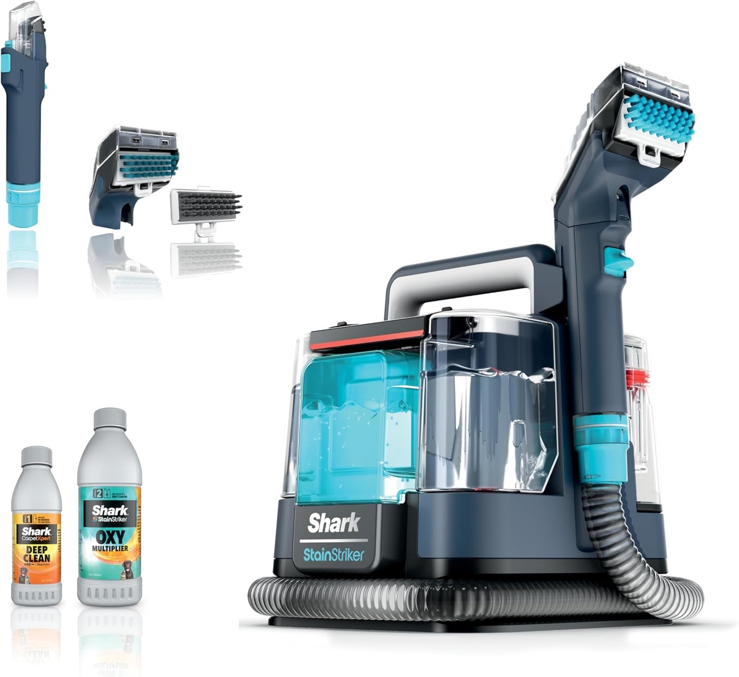 包含物品:Shark StainStriker去渍刷、集成缝隙刷头、3.5英寸双面刷毛刷头、6盎司深层清洁专业配方、12盎司OXY倍增配方