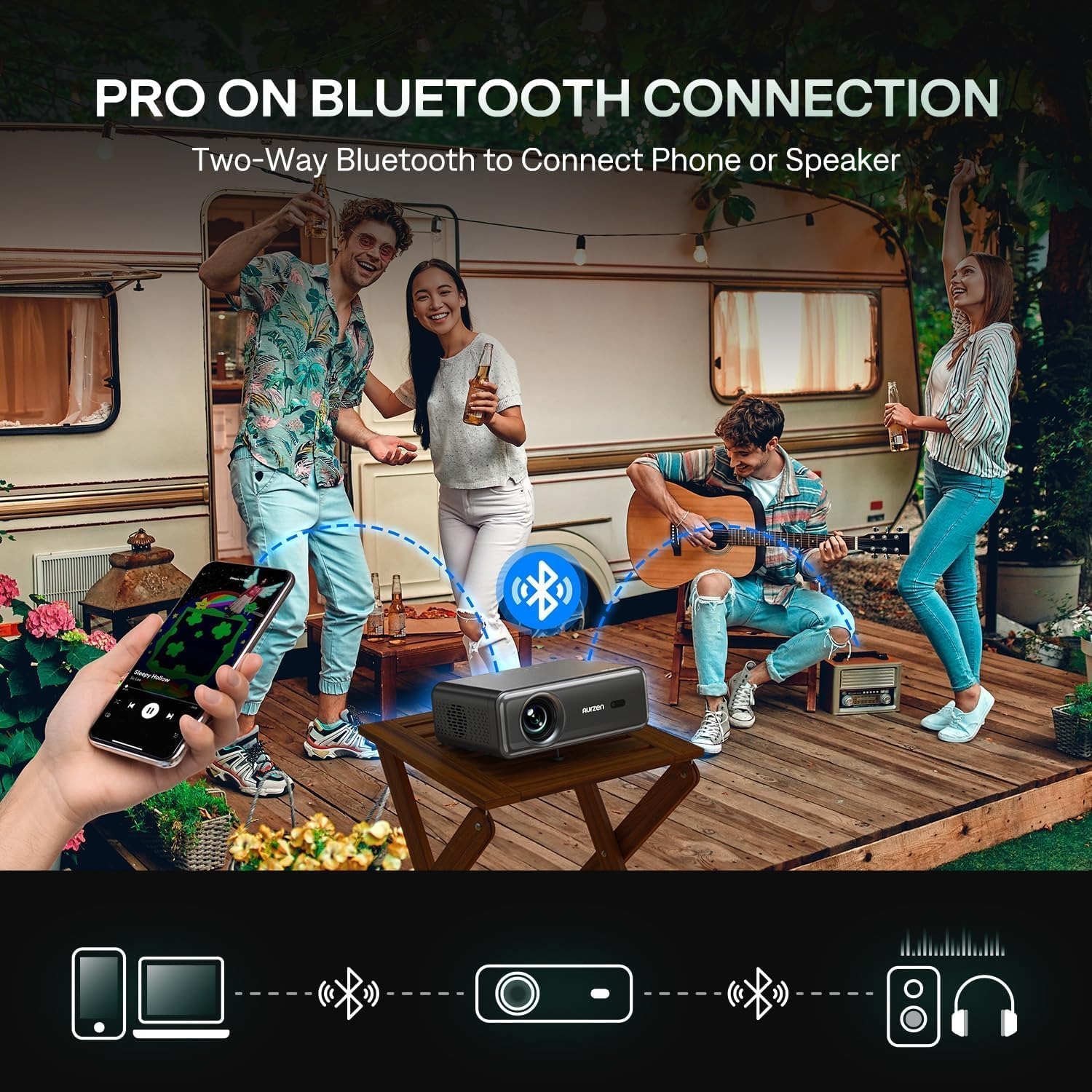 支持5G和2.4G双频WiFi,带来更快更稳定的流媒体体验。双向蓝牙5.2功能使投影仪可以作为蓝牙音箱使用,或连接外部蓝牙音箱、耳机或条形音箱。屏幕尺寸可在40英寸至200英寸之间调节。