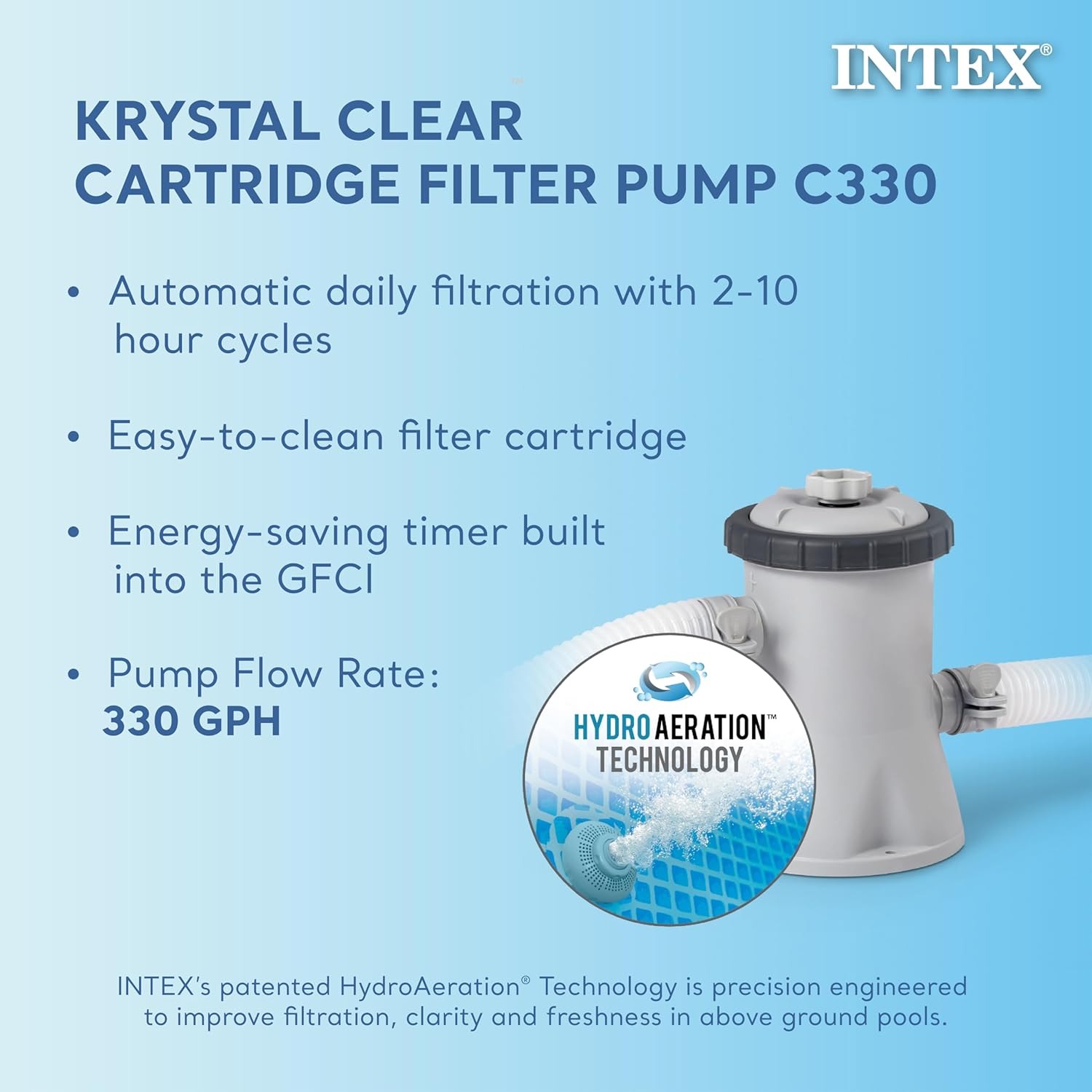 随附一个 530 GPH Krystal Clear 滤芯泵,易于清洁