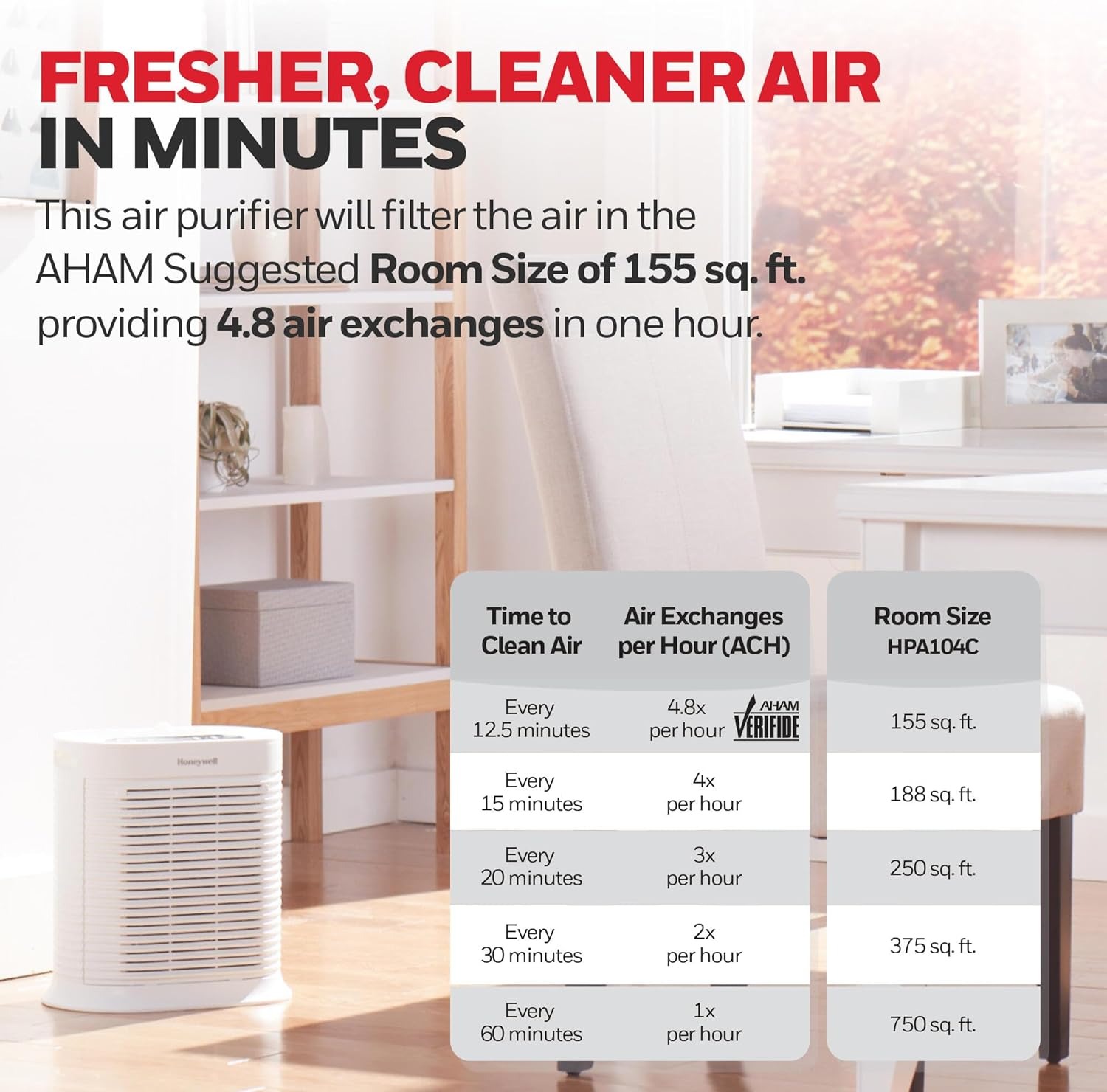 经过AHAM认证。洁净空气输出率 (CADR):烟雾:100,灰尘:106,花粉:100。每小时循环中等室内空气4.8次。建议用于155平方英尺(14.4平方米)的房间。每小时循环室内空气4.8次。建议用于155平方英尺(14.4平方米)的房间。获得能源之星认证。
