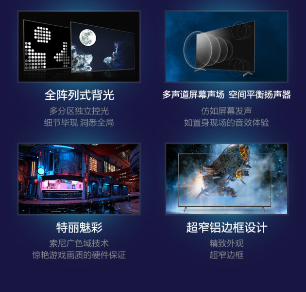 卓越对比,成就不凡,多声道屏幕声场,声色协作,音画合一。