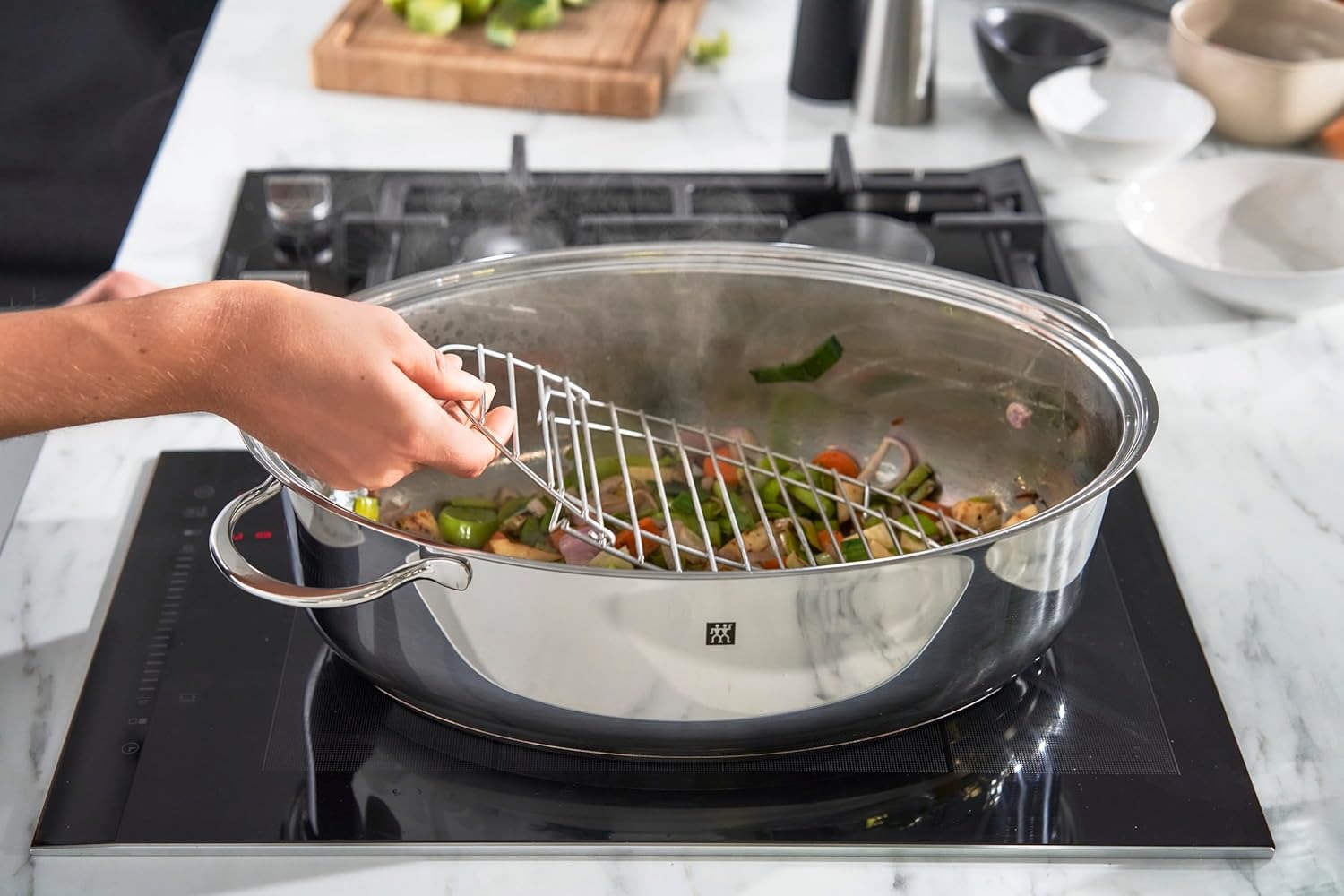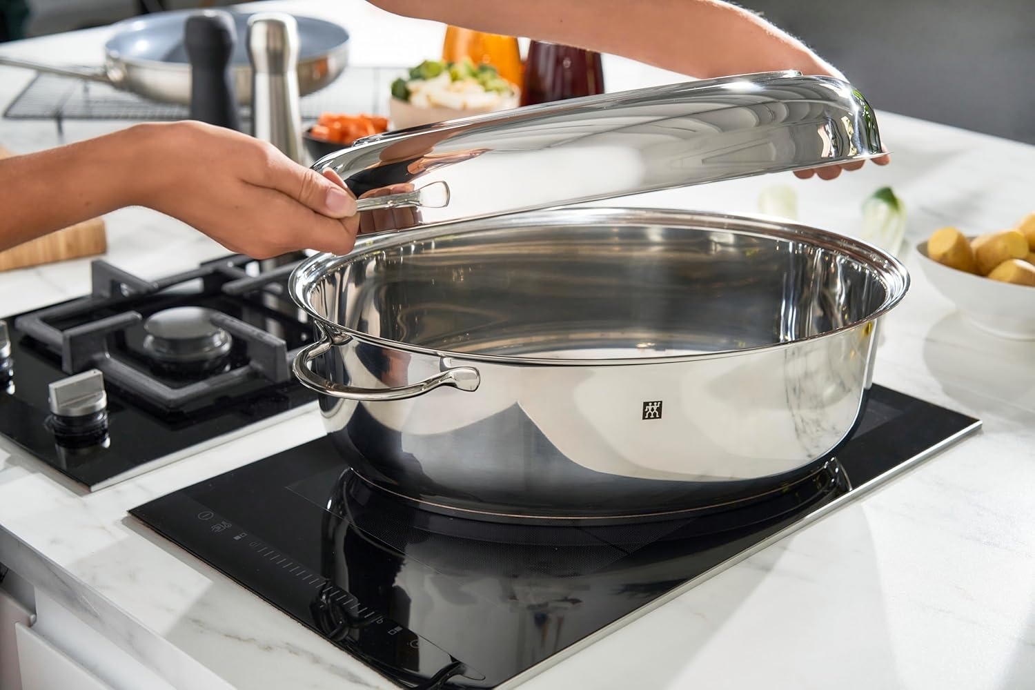 ZWILLING Plus 多功能锅具非常适合煎炒、炖煮和慢烤,采用SIGMA经典结构,主锅和锅盖均采用密封式烹饪底座。这种结构确保热量均匀分布,使所有食物均匀受热。精密贴合的锅盖可兼作辅助烹饪容器,甚至可完美用作盛菜盘。