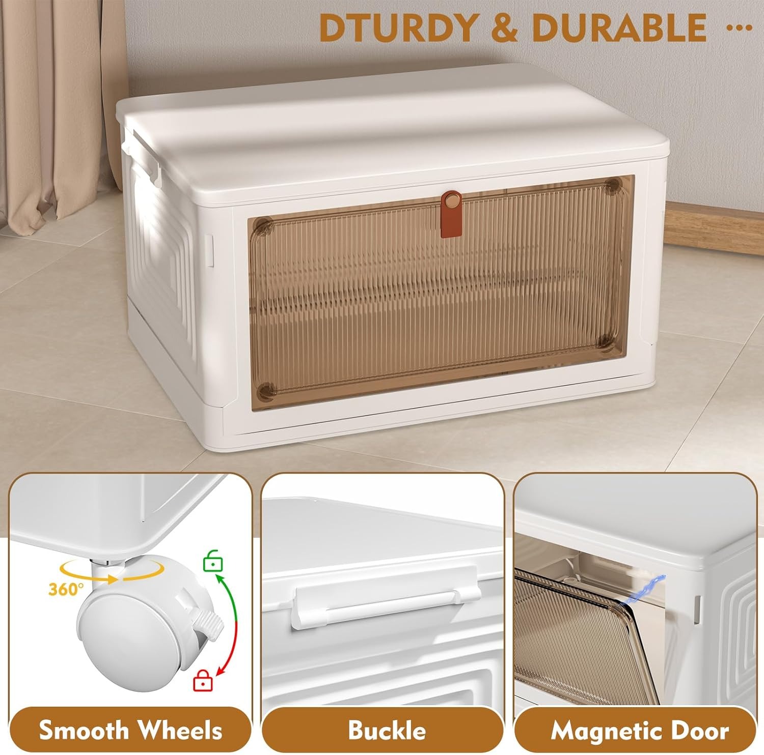 底部有4个轮子,方便移动。此外,收纳盒的两个轮子配有卡扣,可将轮子固定到位,防止其移动。