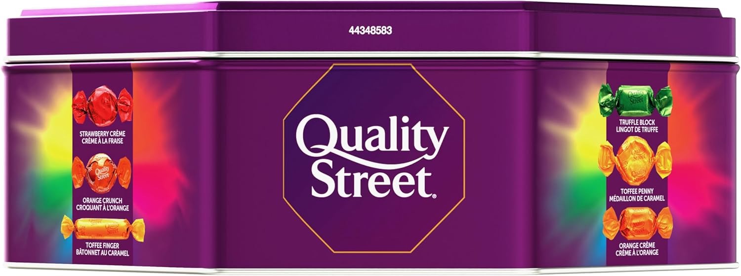 Quality Street包含松露巧克力块、太妃糖便士、橙子奶油、榛子味三角、椰子泡芙、焦糖杯、焦糖榛子、软糖、草莓奶油、橙子脆片和太妃糖手指等多种美味。