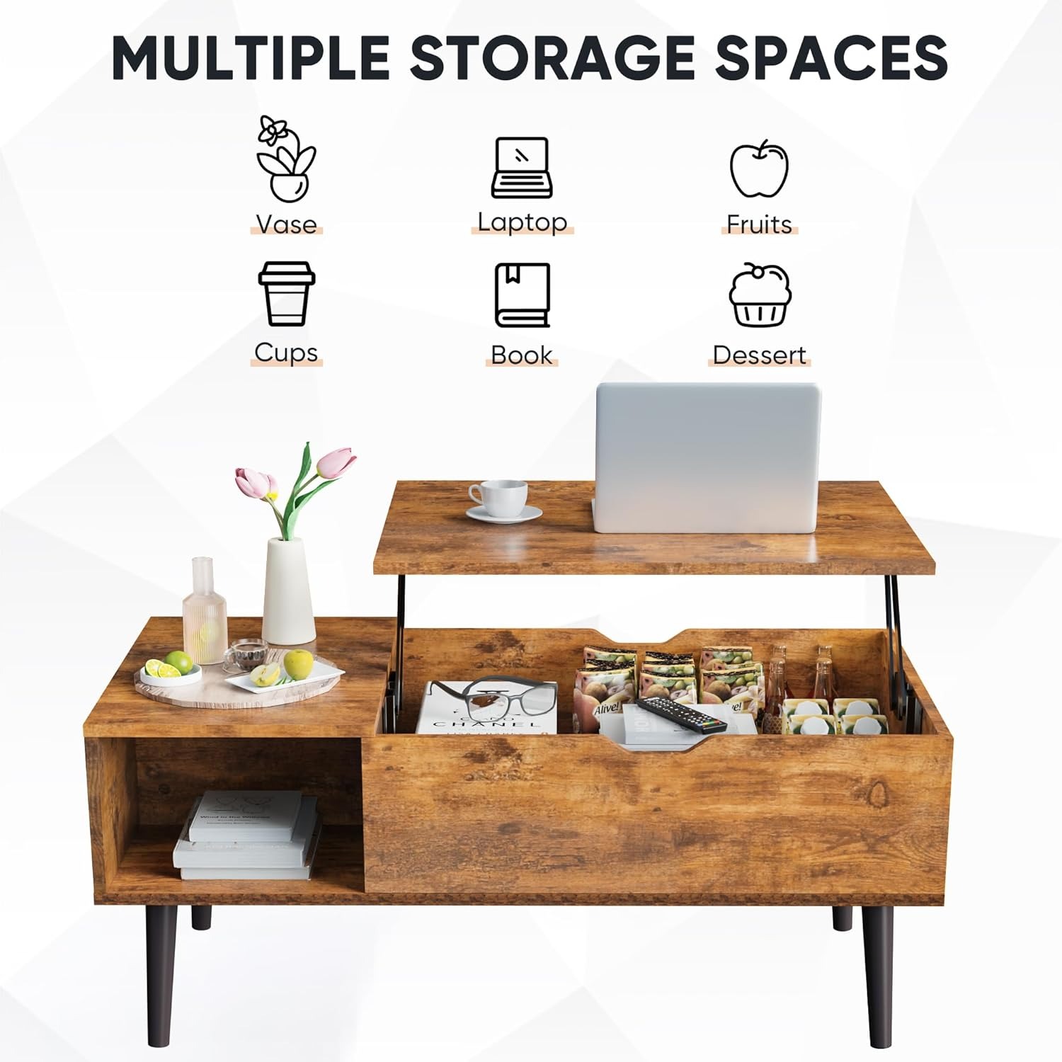 在升降桌面下方预留了宽敞的储物空间,可轻松收纳毯子、书籍和棋盘游戏。此外,两侧的搁架可存放遥控器、零食和其他必需品。