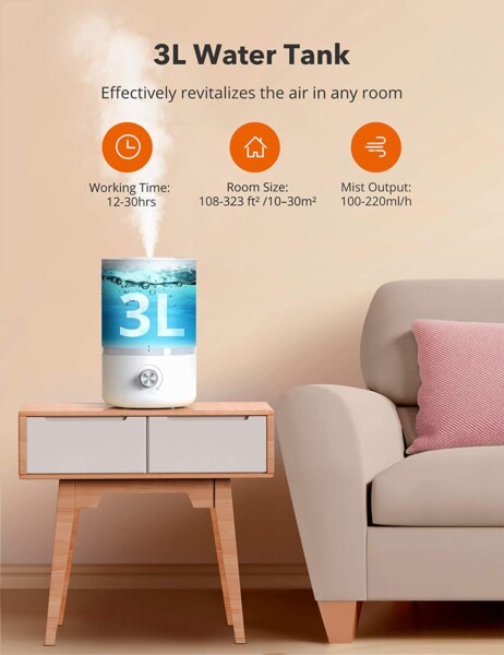 高效加湿:超声波加湿器3L容量提供连续冷雾加湿30小时