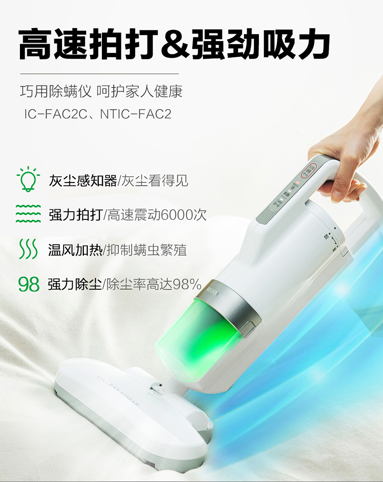 每分钟6000次拍打功能,結合两个旋风气流,3倍提高吸力,搭配暖风机能,高温除螨,还可降低床铺湿度,带灰尘除螨感应器,可从信号灯的颜色,随时得知灰尘除螨的状况,