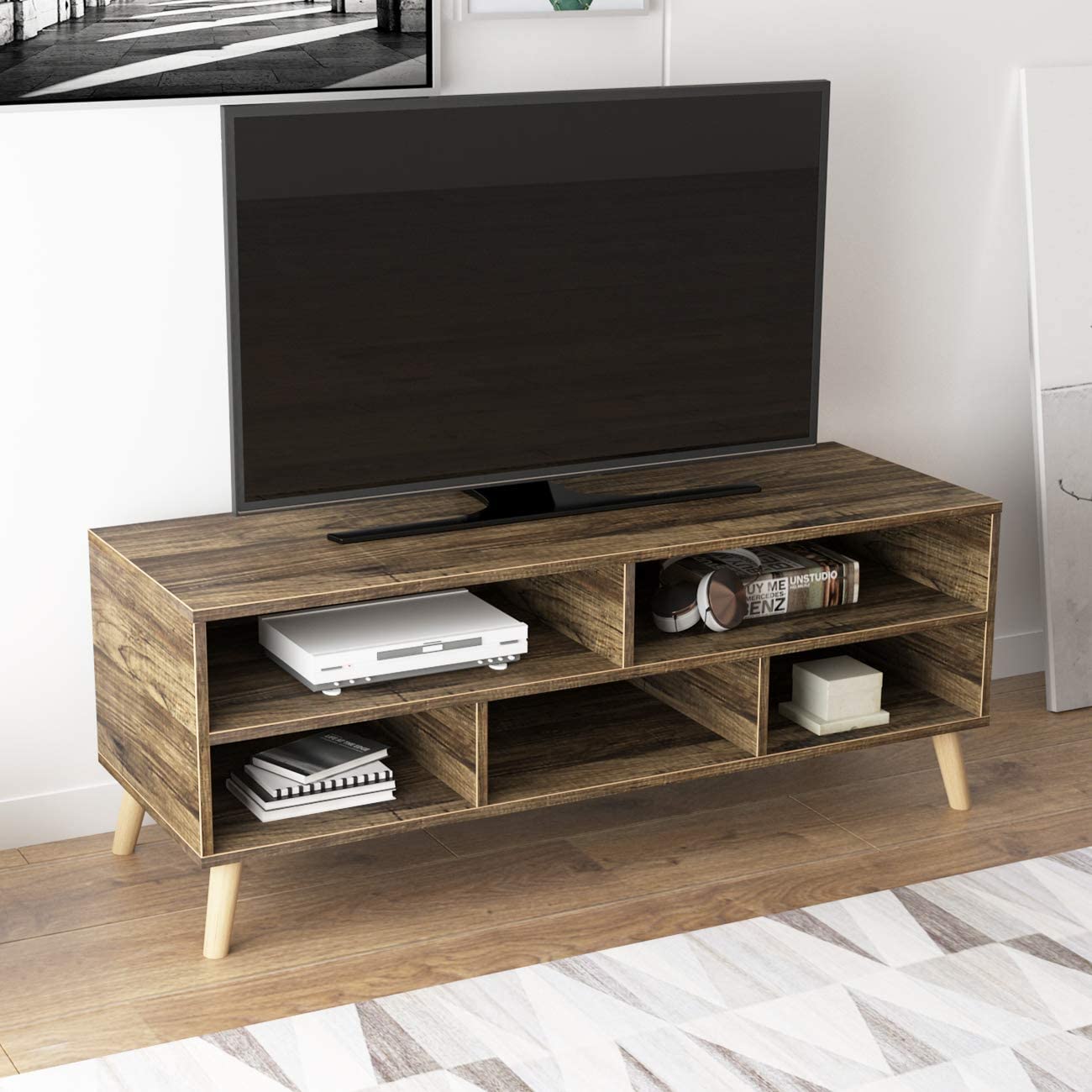 这款木制电视柜尺寸:44.7 x 15.7 x 14英寸。最多可容纳44英寸宽和高达70磅的平板电视。