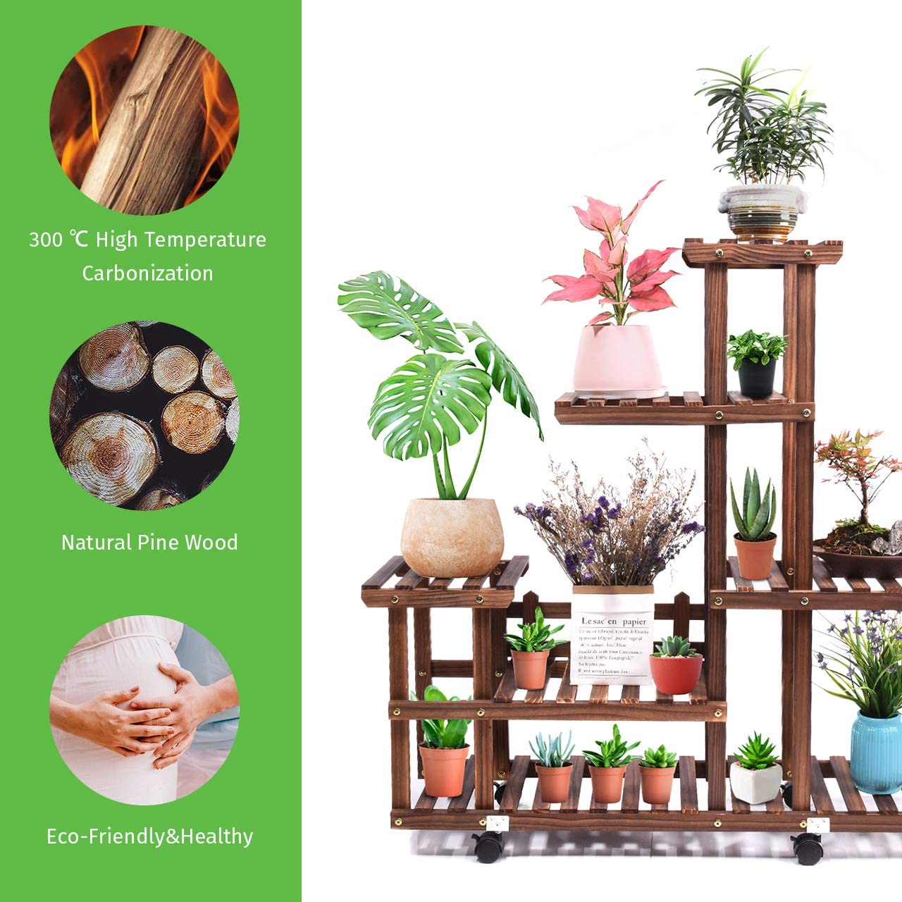 经过300℃高温深度碳化,保证质地不褪色、不收缩、不翘曲、不开裂。花架不需要油漆,更环保。