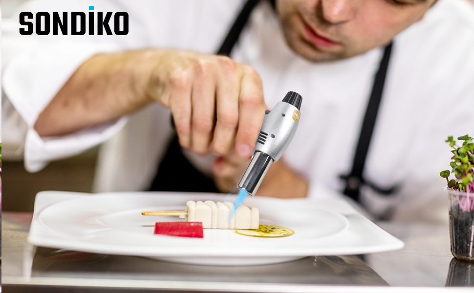 Sondiko厨房喷枪适合任何品牌的丁烷气体罐,无论是长喷嘴还是短喷嘴,可轻松重新填气。