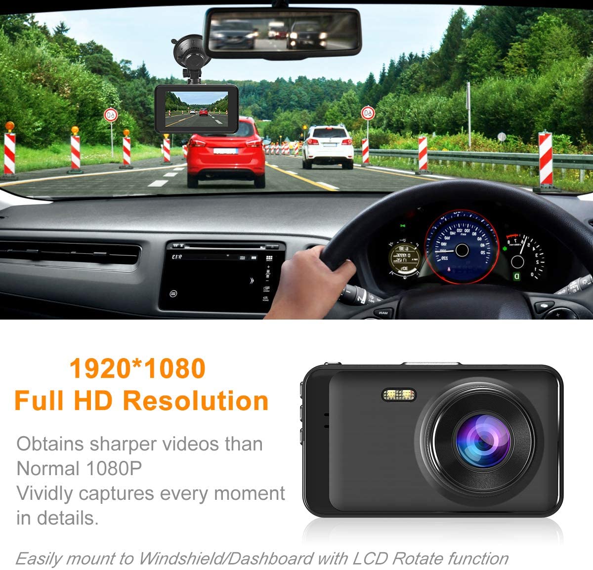 3英寸LED全高清1080P仪表盘, 配有sd卡FHD 1920X1080P的行车记录仪,以每秒30帧的速度拍摄视频,可以捕捉每一条道路的状况和车牌的详细信息。你可以看到30英尺外车辆上的车牌。3英寸超大IPS显示屏,可显示实时图像,帮助您在使用sd卡播放此车载摄像头时,尽可能清晰地看到每个细节。