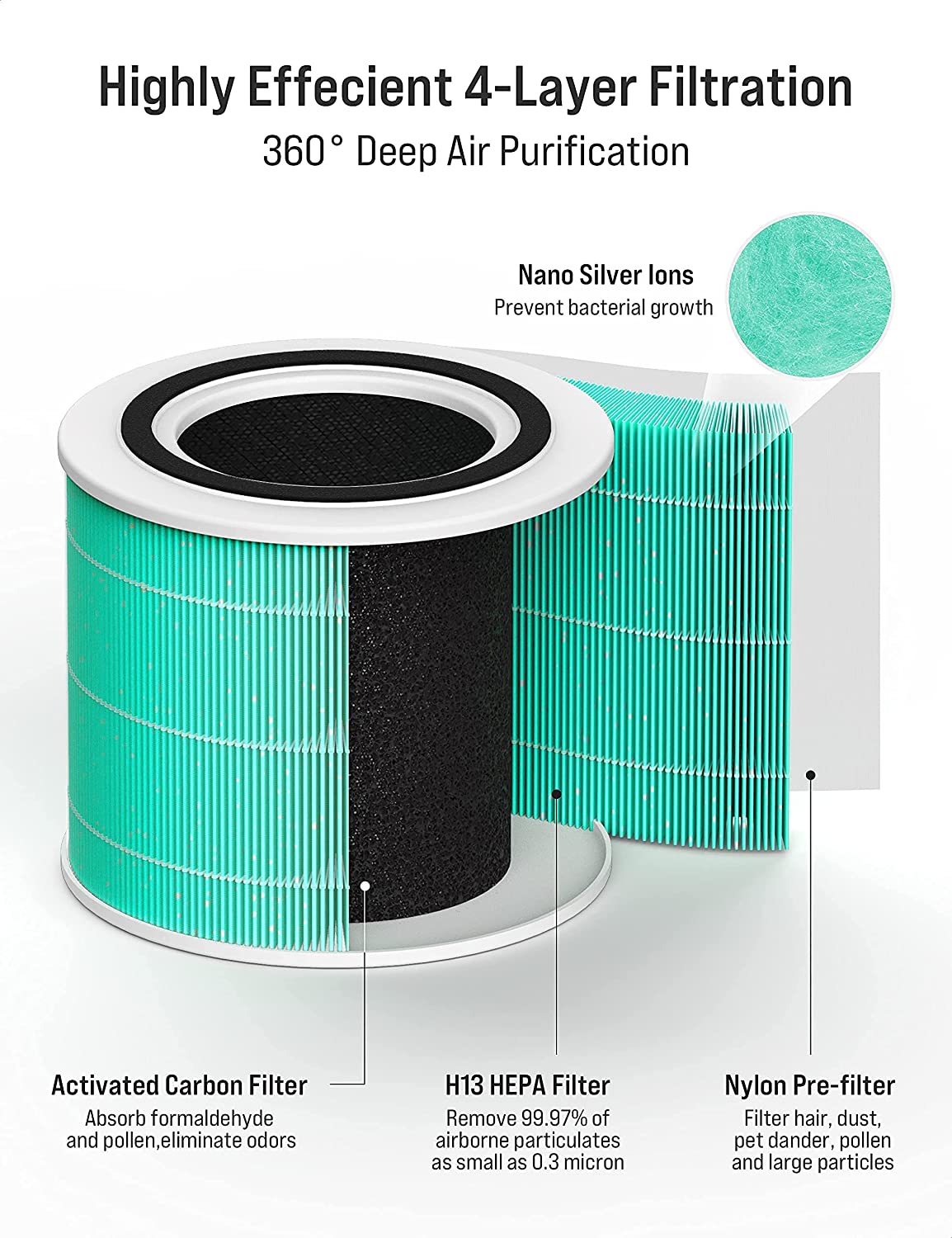 H13真HEPA过滤空气净化器采用纳米过滤技术,4层过滤,由尼龙预过滤器、纳米银离子、H13真HEPA过滤器和活性炭过滤器组成,有效抑制细菌生长,并去除灰尘、宠物皮屑、花粉、霉菌、过敏和其他空气污染物。
