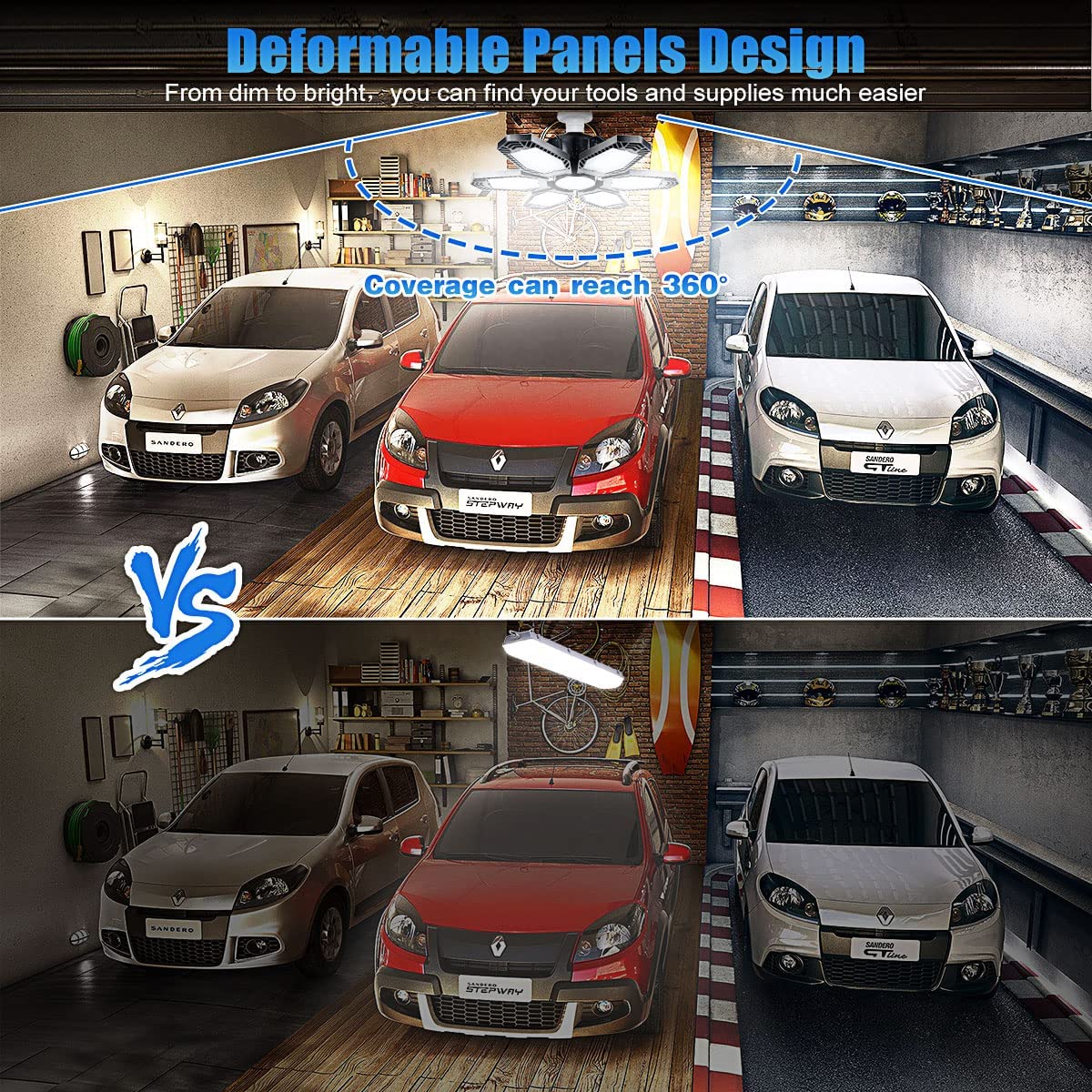 6000LM LED照明可折叠至90度,因此您可以根据需要分配光线。可从四面照明,实现更大的照射面积,无盲点和阴影,为您的车库提供最佳照明效果。
