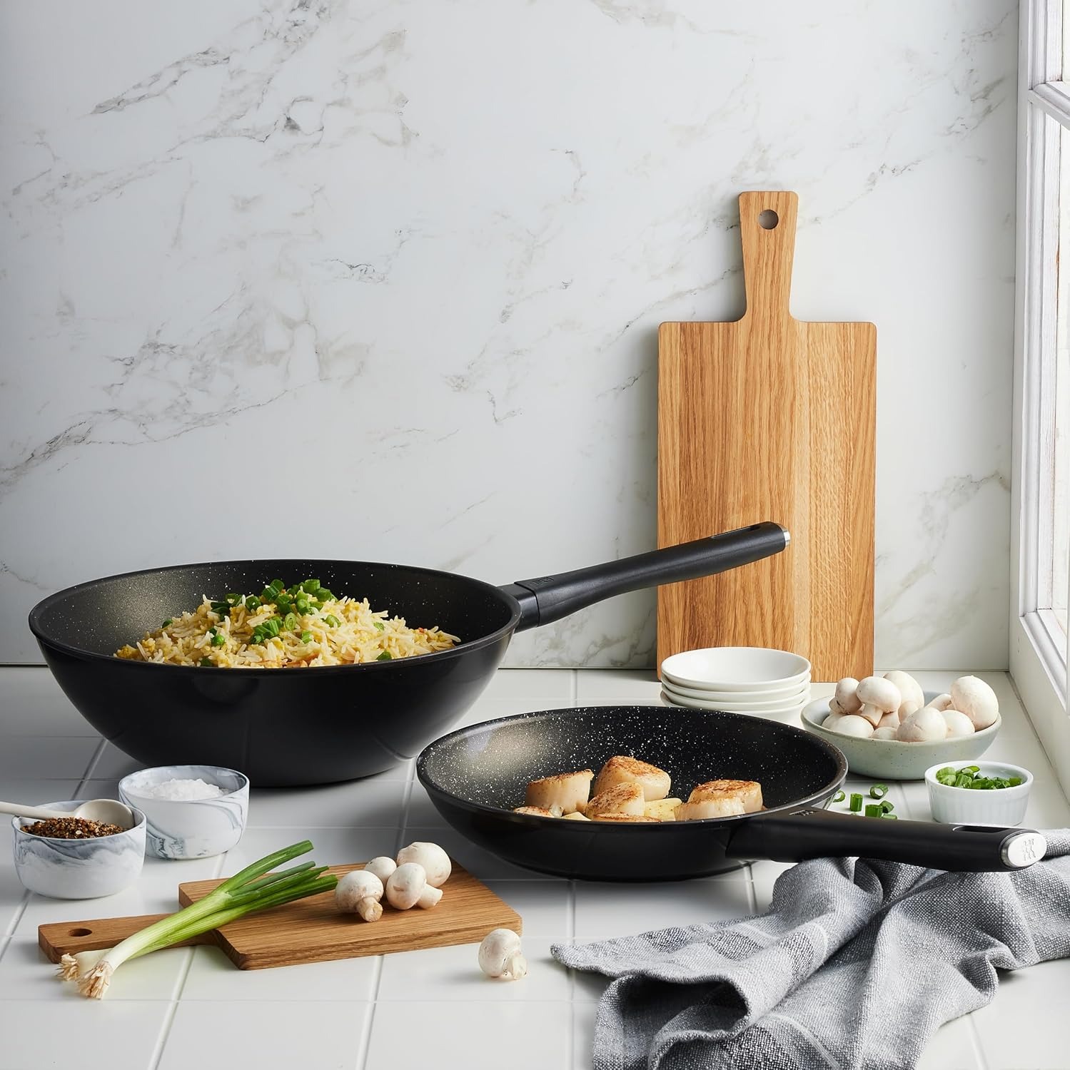 套装包括一个 9.5 英寸煎锅和一个 12 英寸炒锅