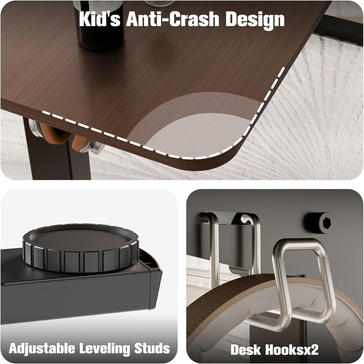 宽敞的工作区,桌面尺寸为 55.1 英寸 x 23.6 英寸(140 x 60 厘米),可容纳各种显示器和笔记本电脑。可以将所有必要的办公用品放在办公桌上。桌子两侧均配有挂钩,方便悬挂包袋或耳机,方便存放。
