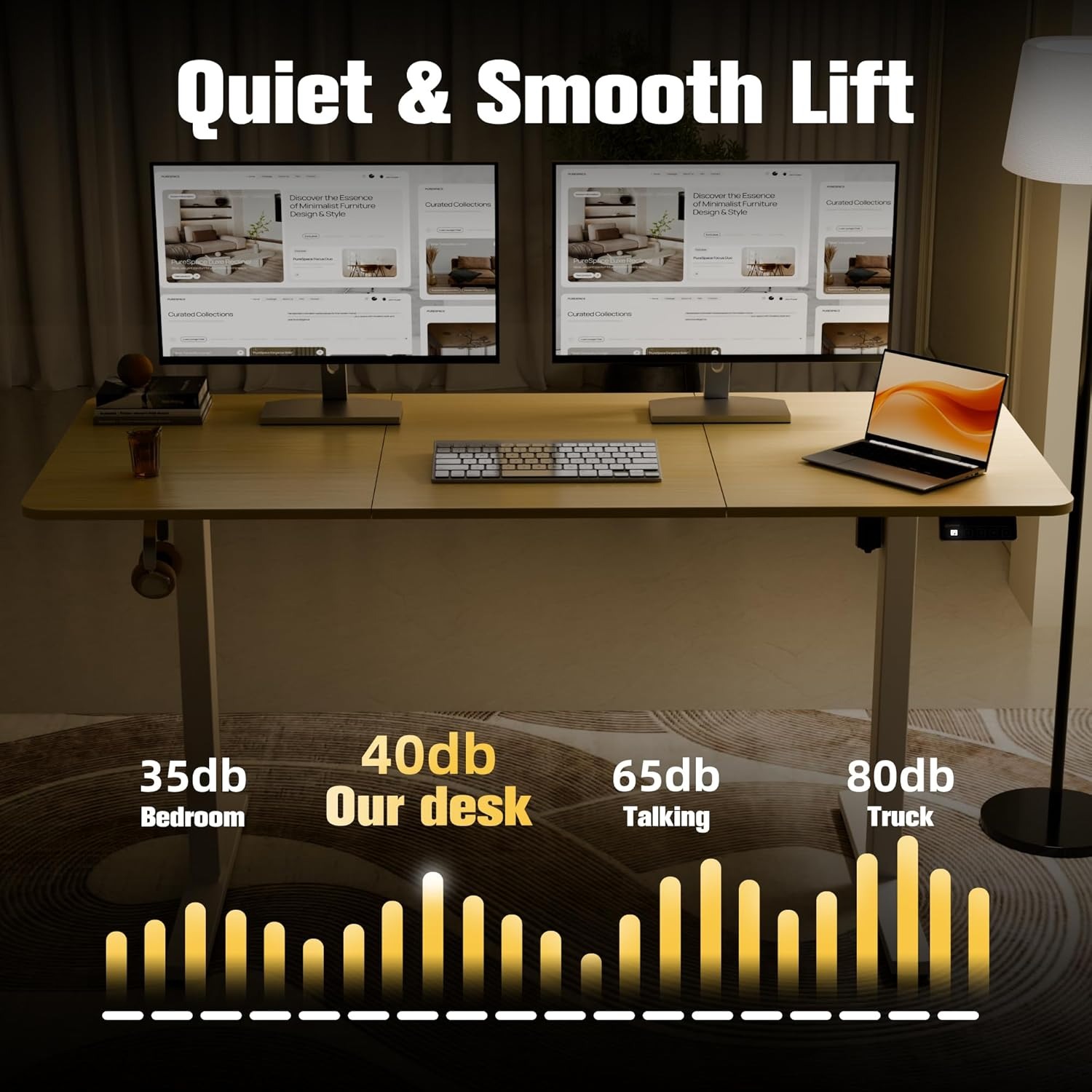 采用重型钢制成,坚固耐用,承重能力达154磅(70公斤),移动速度为每秒0.6英寸(14毫米),即使办公桌升至最高点也能保持稳定。软启动/停止功能使办公桌移动平稳安静(<50dB)。
