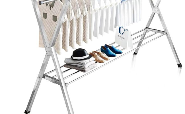 亚马逊现有 JAUREE 2.13米 可伸缩 可折叠 不锈钢大型晾衣架特卖+包邮! 需点击coupon 伸缩式晾衣杆可以轻松调整以适应不同的需求。顶部两根可伸缩晾衣杆和中间的扁平晾衣架,有足够的空间来晾晒特大号床罩、床单、毯子、地毯