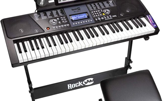 亚马逊现有 RockJam 561 61键电子琴套装 特卖+包邮!附送琴凳、耳机! 带有61个全尺寸琴键的数字键盘,可获得传统钢琴的感觉,同时保持便携和紧凑的设计,可通过主电源(含电源)或电池供电 配有LCD显示屏,可显示和激活100