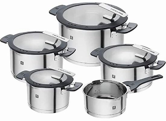 亚马逊现有Zwilling 双立人 Simplify 不锈钢锅具5件套特卖+包邮!官网原价:750加元 勾选coupon再降! 18/10不锈钢,锅底使用Sigma Classic + 三明治底座设计,加热均匀保温良好,同时易于清洁。