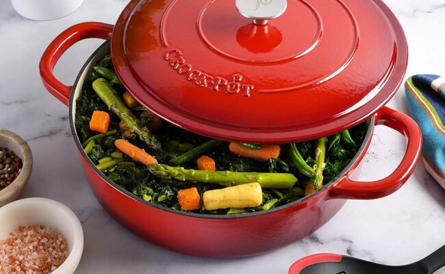 亚马逊现有经典品牌 Crock Pot 5夸脱 Artisan 彩色珐琅铸铁锅特卖+包邮! 5夸脱容量,可用来炖煮,烘培,或直接存放食物,易清洗不粘无锈表面 安全触摸手柄 烘箱安全, 500° F 与所有热源包括天然气,电,感应炉等