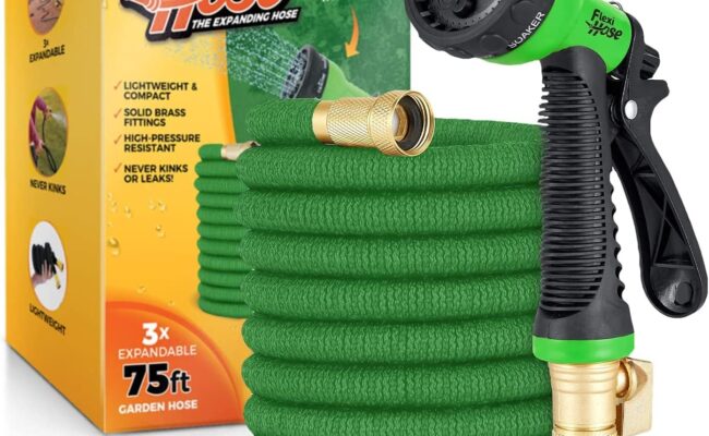亚马逊现有 Flexi Hose 75英尺 带8速喷头弹性伸缩水管特卖+包邮! 轻质可扩展,额外强度,喷头有8种水速可选 3/4 英寸(约 1.9 厘米),实心黄铜配件,经久耐用抗腐蚀 双层加厚乳胶内层+高密度聚酯外层结构,永不扭曲缠