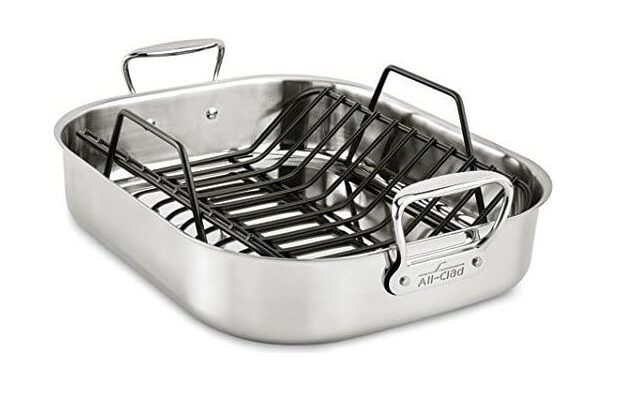 亚马逊现有高端厨具 All-Clad 不锈钢大烤盘带烤架套装特卖+包邮!11×14英寸,可容纳20磅的火鸡 重型不锈钢烤盘带烤架,将肉类、家禽和蔬菜烤得尽善尽美。高边沿可减少飞溅,比例匀称的直立把手很容易抓握。 由厚而耐用的