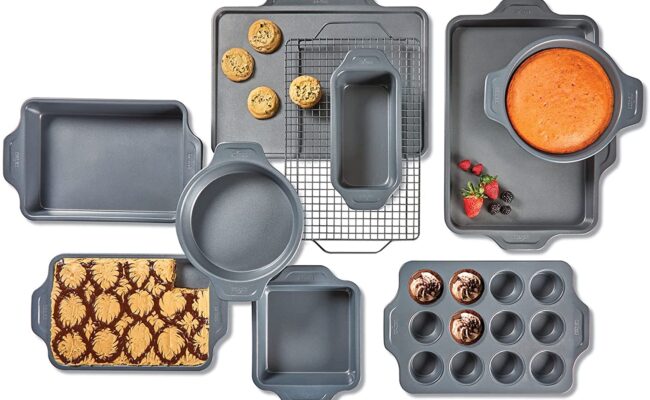 亚马逊现有高档厨具品牌 All-Clad 商用级陶瓷增强不粘烤盘10件套特卖+包邮!安全高品质,无PFOA 为专业厨师、家庭厨师和面包师打造专业烤盘 由耐翘曲的商用级镀铝钢制成(可在450°F的烘箱中使用) 涂有不含PFOA的陶瓷增强
