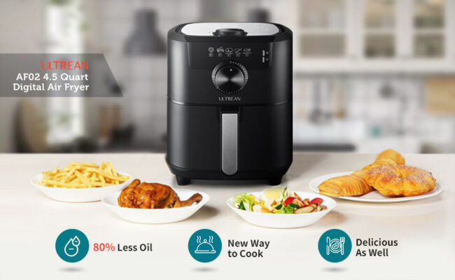 亚马逊现有Ultrean 4.5夸脱健康无油全自动空气炸锅特卖+包邮! 享受轻油脂的健康油炸美食,而且不用担心油脂喷溅带来的安全隐患 多功能设计,不仅可以做炸锅还可烘烤食物 操作简单快速,360度加热,液晶显示屏,5个烹饪选项和两个控