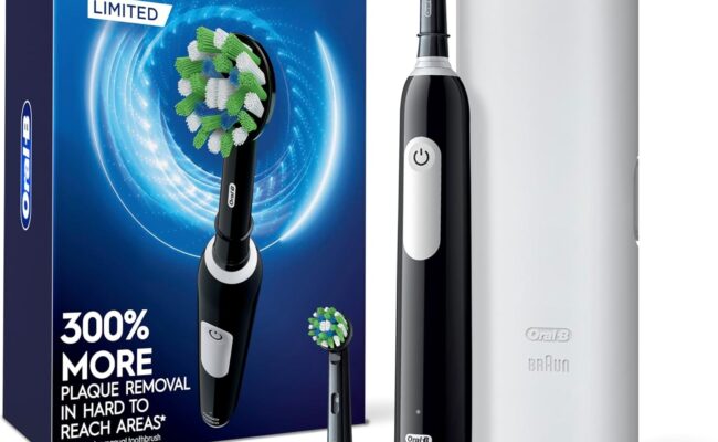 亚马逊现有 Oral-B Pro Limited 可充电电动牙刷特卖+包邮! 采用专业设计的CrossAction刷头,以16度角包裹每颗牙齿,3D清洁动作通过振动、旋转和脉动进行,与普通手动牙刷相比,可清除牙龈线上 300% 以上的
