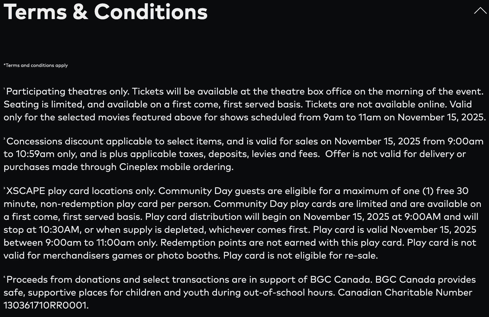 最后,Cineplex表示,在The Rec Room和Playdium,每售出一份食品饮料、购买或充值一张Xscape游戏卡以及购买或充值一个游戏手环,都将捐赠$1.00给BGC Canada组织。该慈善机构通过改变人生的项目、社区服务等方式,为儿童和青少年提供支持。